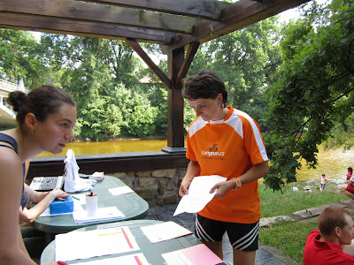 Výstřel a chvilička klidu. Kontrola, zda něco nepotřebuje časomíra, občerstvení a dalších pár úkolů a už tu byla první závodnice. Holky všechny doběhly a došly poměrně brzo, statečně (bylo horko a dusno) a hlavně v dobré náladě, to mě moc potěšilo. Zbývalo 8 minut do vyhlašování a my fofrem uklízeli start a cíl. 2 minuty, honem se převléct a svolat závodnice na terasu na vyhlášení. Ale to jsem se poněkud unáhlila, v domnění, že má Leona už všechno nachystáno :) Nakonec jsme to ale nějak zvládly, i když už jsem tedy byla poněkud vyčerpaná a když Leona přeskupovala hromádky s cenami, honem se to snažila nachystat a Sára na ní provokativně pokřikovala, začala jsem do toho křičet taky, ať jsou všichni zticha, ať se může Leona lépe soustředit :D A za zády nám stály všechny účastnice a už několik minut čekaly na vyhlášení. Vyhlášení se v rámci možností taky skoro povedlo :)