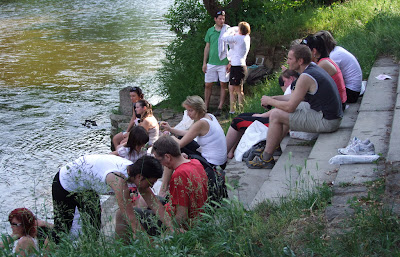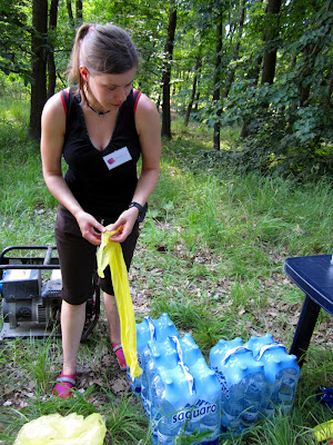 Přišel čas startu. Těsně před startem už bylo všechno připraveno a na chvíli jsem se mohla zastavit, když tu se někde vynořila televizní redaktorka a byla nadšená Evženovou Sárou a chtěla, abychom si o ní něco povídali. Ehm, teď, něco o Sáře, co proboha? V hlavě naprosté prázdno a když už se něco vynořilo, byl to spíš typu, zda tu máme dostatek odpadkových pytlů, kolik vody vychází na jednu závodnici, jestli jich nepřiběhne chumel a stihneme sundat čipy, jestli se žádná neztratí, jak ti komáři koušou, jestli nepřijde bouřka, protože se podezřele zatáhlo, co budu dělat, když přijde bouřka, že nevím, co mám říkat že budu vypadat jako úplný idiot. A přesně tak to dopadlo, tvářila jsem se jako blbec a nevydala ze sebe asi ani jednu smysluplnou větu, možná ani slovo, už sama nevím. Snad to vystřihnou :)